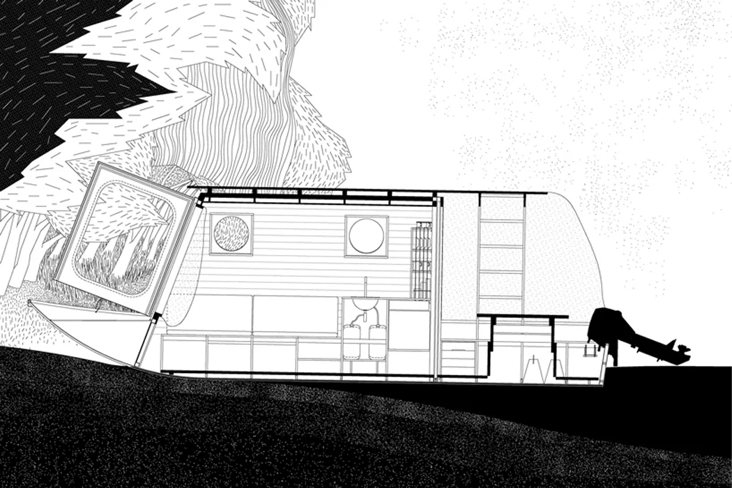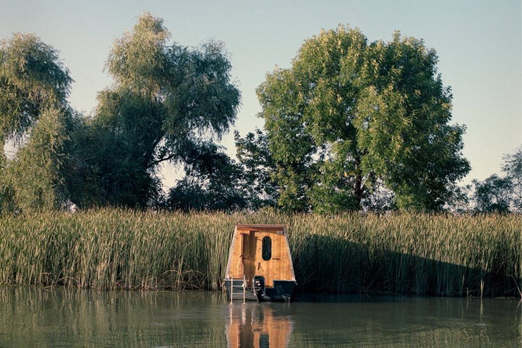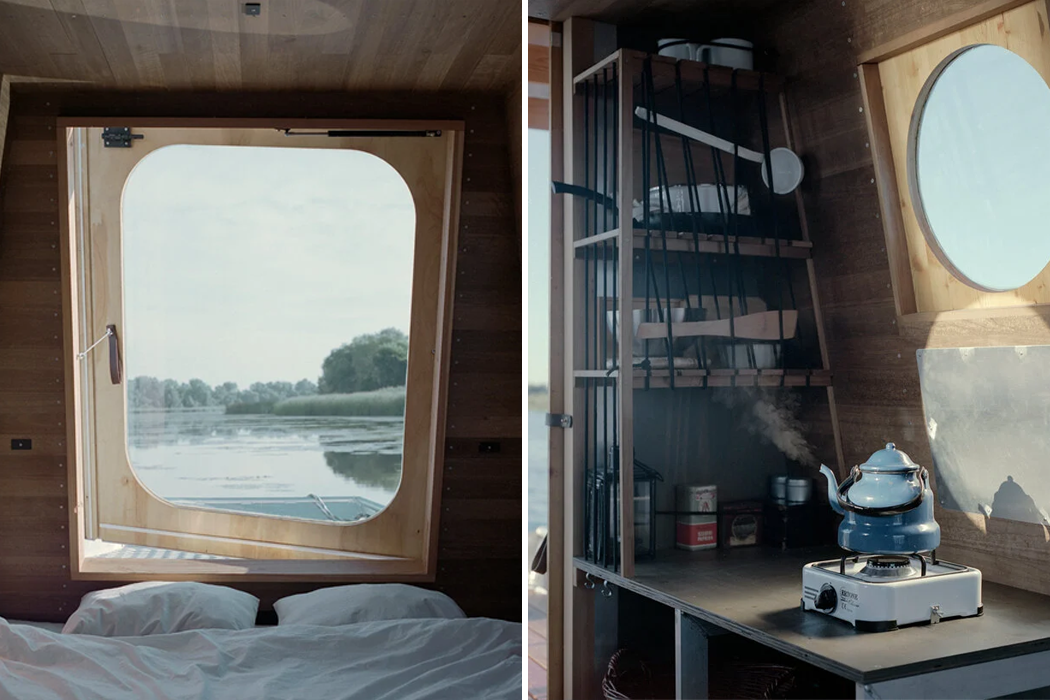 However, building Sneci to blend in with Lake Tisza’s shoreline shrubbery and trees required some energy-efficient sources of power for a water system and electricity. Two solar panels line Sneci’s roof and generate enough electricity to power up electrical equipment in the houseboat’s tiny kitchen, which includes a small refrigerator, light fixtures, and one gas-powered stove plate. The kitchen’s sink requires no electricity since drinking water can be obtained through a foot pump that delivers water from a 20-liter bottle. Tamás Bene said, “We aimed to design a boat capable of assimilating into these surroundings, one that may become part of this scenery.” With a fully-contained water system, an energy-efficient source of electricity, and a modular, compact living space – I think it’s safe to say, he completed what he set out to design.