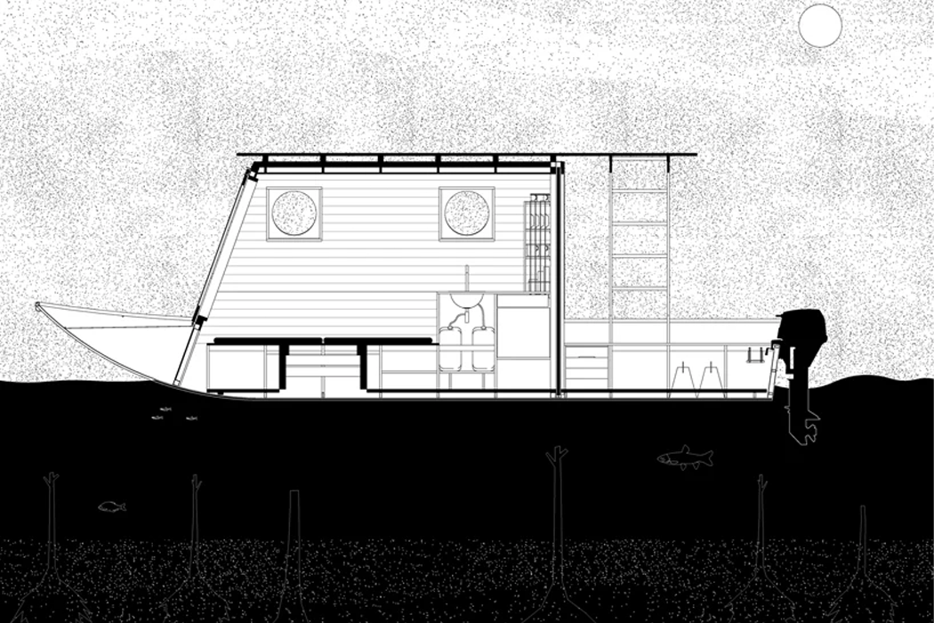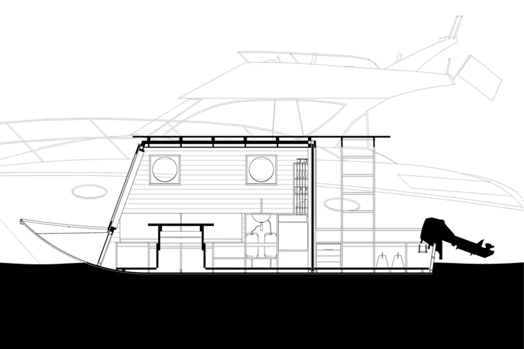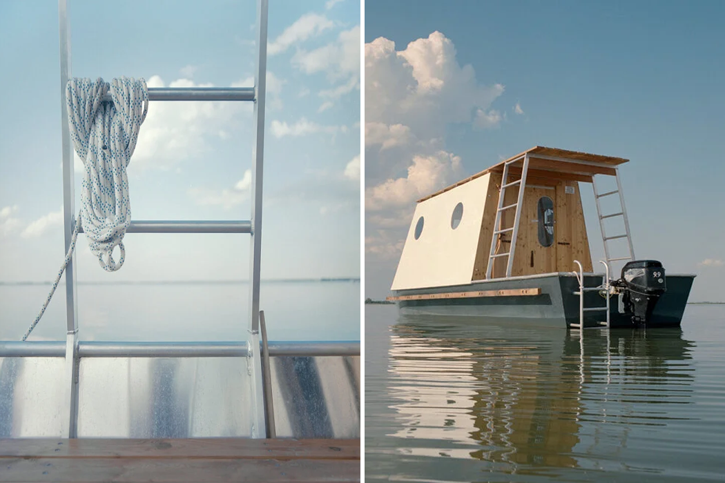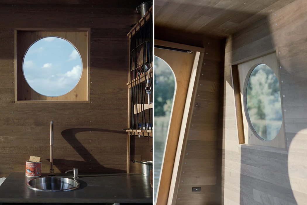Sneci’s pace might mimic its namesake, ‘the snail,’ with a smaller 9.9 internal combustion engine, but Bene and his clients wanted a houseboat that could bring them through Lake Tisza’s curving waterways slowly. In fact, Sneci was built for leisure. After all, the fisher’s lifestyle, which inspired the boat’s overall design, has a way of slowing things down. Bene looked to other boats dotted along Lake Tisza’s shoreline, like fishing boats, for their compact, yet functional operation – hoping to maintain an overall small size and adaptivity standard so that the houseboat’s residents could move modestly on the water, but purposefully indoors. Managing to incorporate a small kitchen, dining area, and double bed in Sneci’s small space, Bene paneled the boat’s interior walls with thermo-wood and Redwood timber. Since designers structure fishing boats primarily according to each fisher’s needs, the final vessel prioritizes practicality above aesthetics. Hoping to find a way to bridge the two, Bene maintained the houseboat’s inherent minimalism in maintaining a compact living space, while integrating subtle, nautical design accents for both the boat’s interior and exterior. Most of Sneci’s exterior cladding and structure are built from aluminum and then covered with a stately, snow-white coating. Besides aluminum, Bene utilized heat-treated thermo-wood for Sneci’s roof, decking, and back wall. Smaller portholes provide the interior living space with views of the lake and a larger, floor-to-ceiling door offers a fuller view and opens up to the houseboat’s bow deck and the artificial lake’s outdoor wonders.