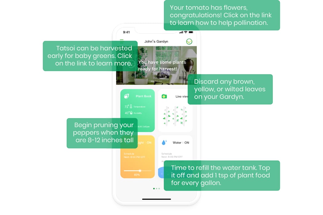 Kelby, Gardyn’s accompanying app automatically takes care of your plants by tracking their development with two high-resolution cameras.